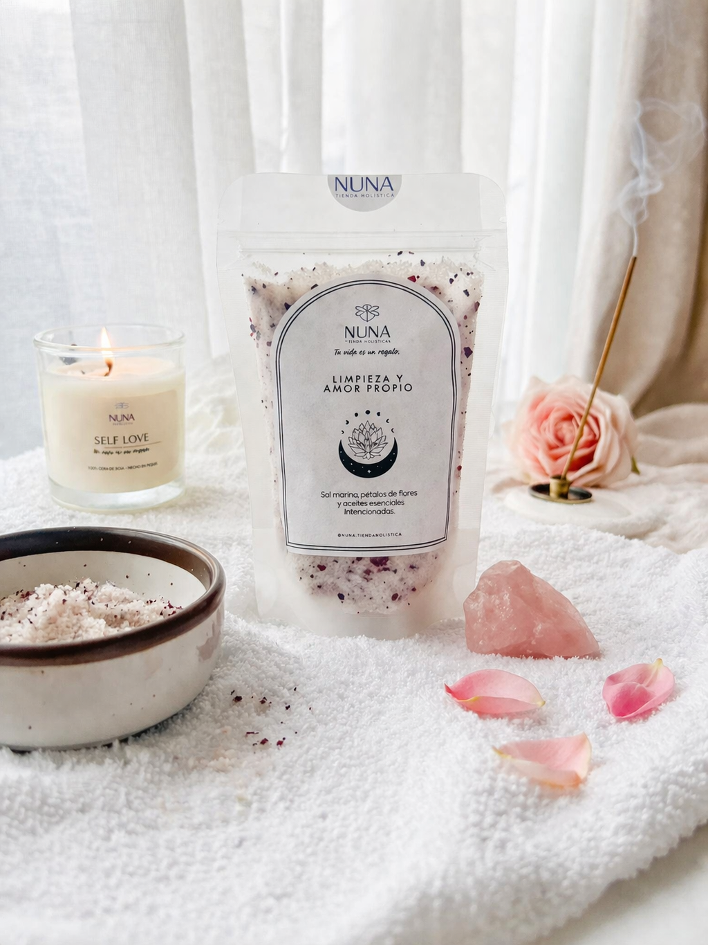 Toma un puñado de nuestra sal ritual y masajea sobre tu cuerpo con movimientos suaves y consientes.